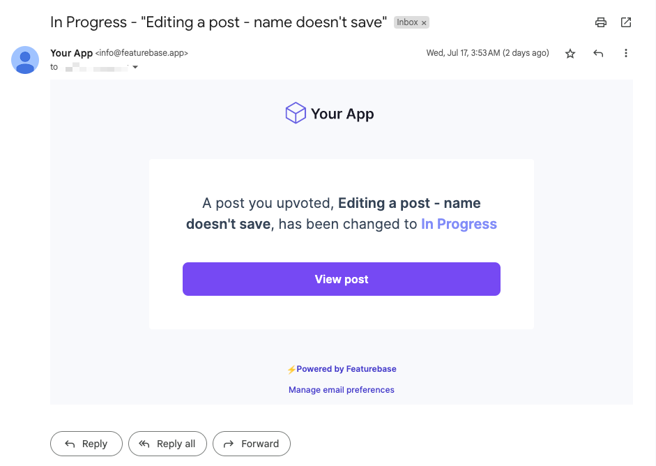 A dedicated feature request tool sends automated updates every time something happens with a feature request. If it’s moved to the backlog, sent to production, finished or something else - the users who submitted the request, voted, or left a comment all get an email with the latest changes.