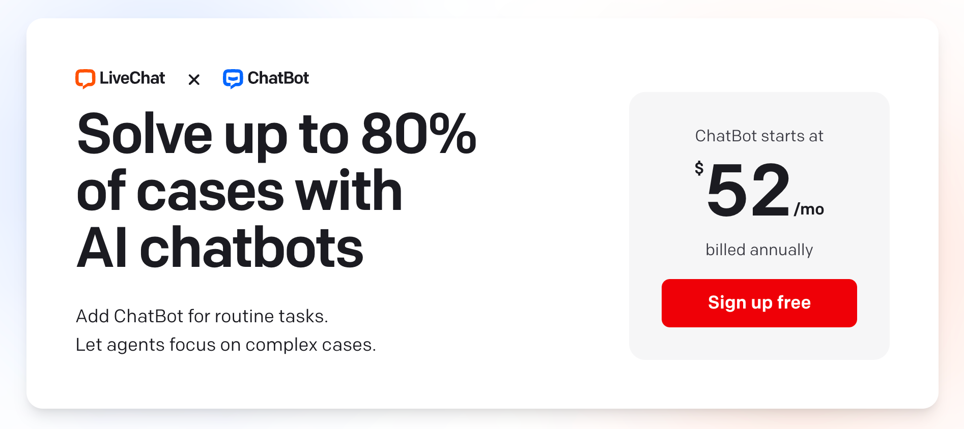 To get fully automated AI chatbots, you need to purchase ChatBot separately, which is an AI agent that resolves "up to 80% of cases". This is a feature that costs $52 per ChatBot.