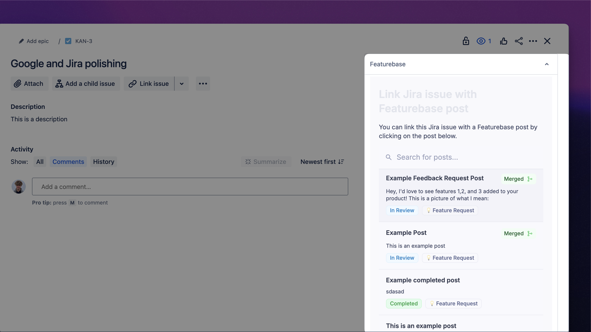 Syncing your development in a tool like Jira with the corresponding feedback in Featurebase will help you automatically keep upvoted users updated about the progress of their requests.