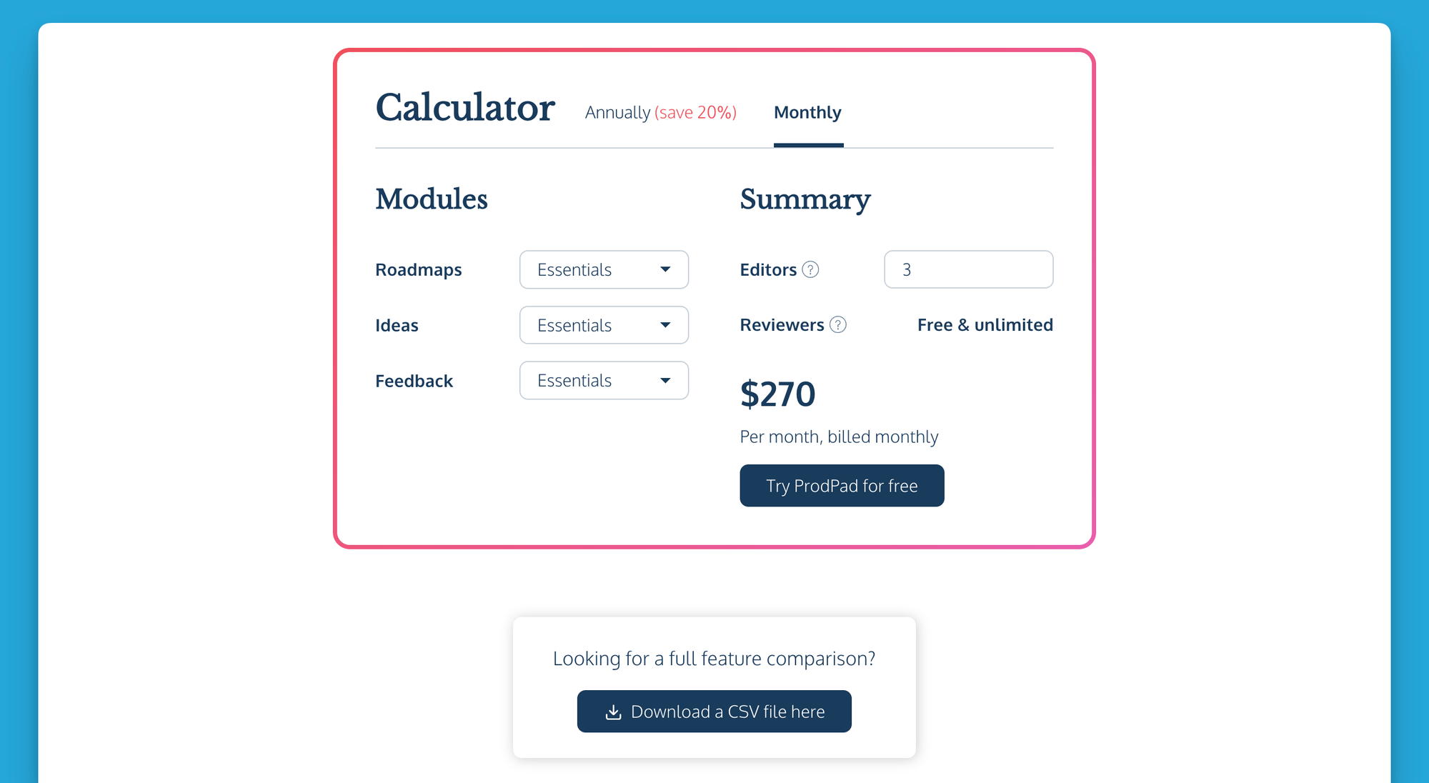 ProdPad offers an entire product management software suite, but broken down into parts you can purchase separately, like Barbie house furniture. Since it can be quite complicated, they also have a calculator on their pricing page.