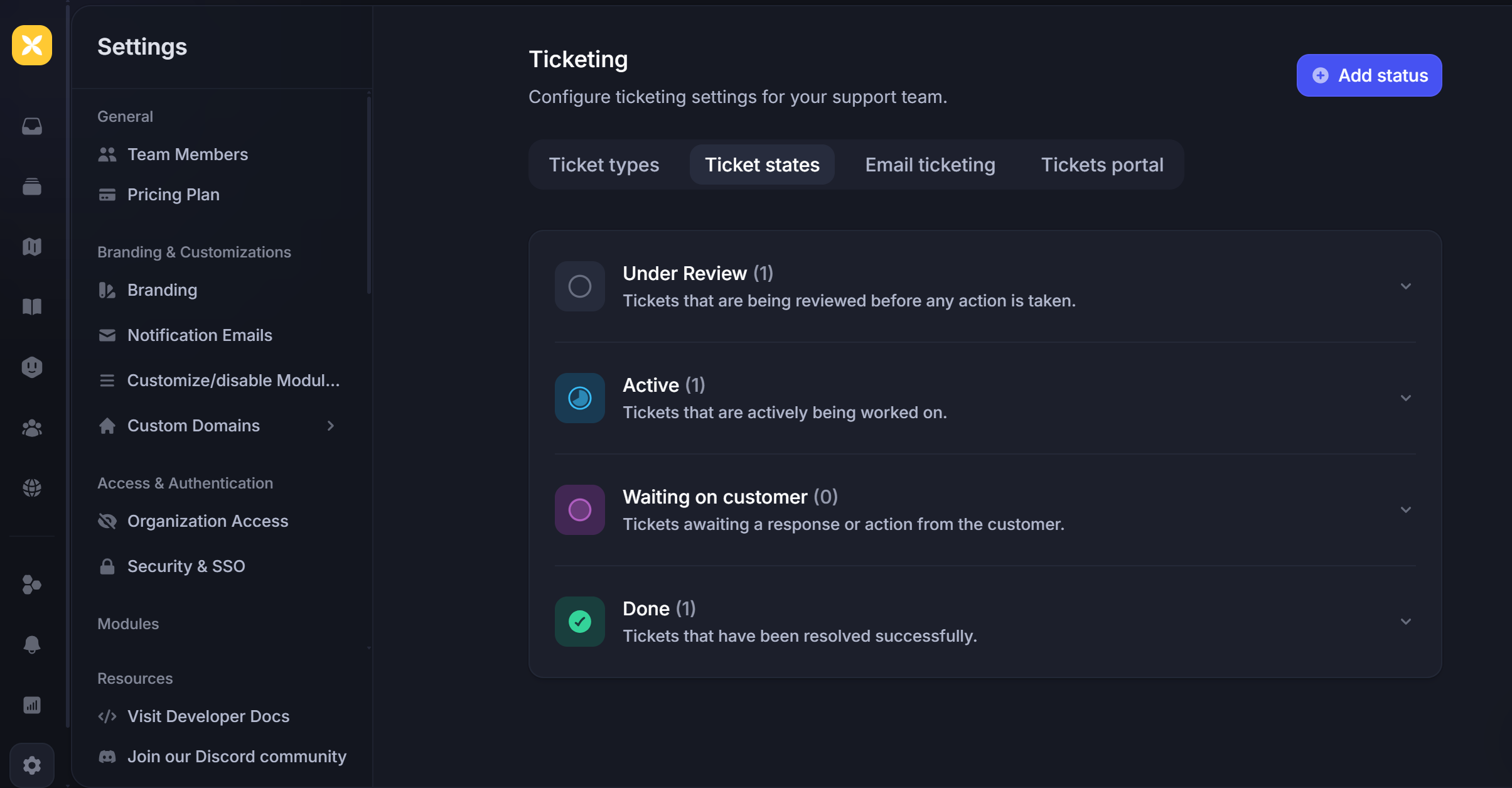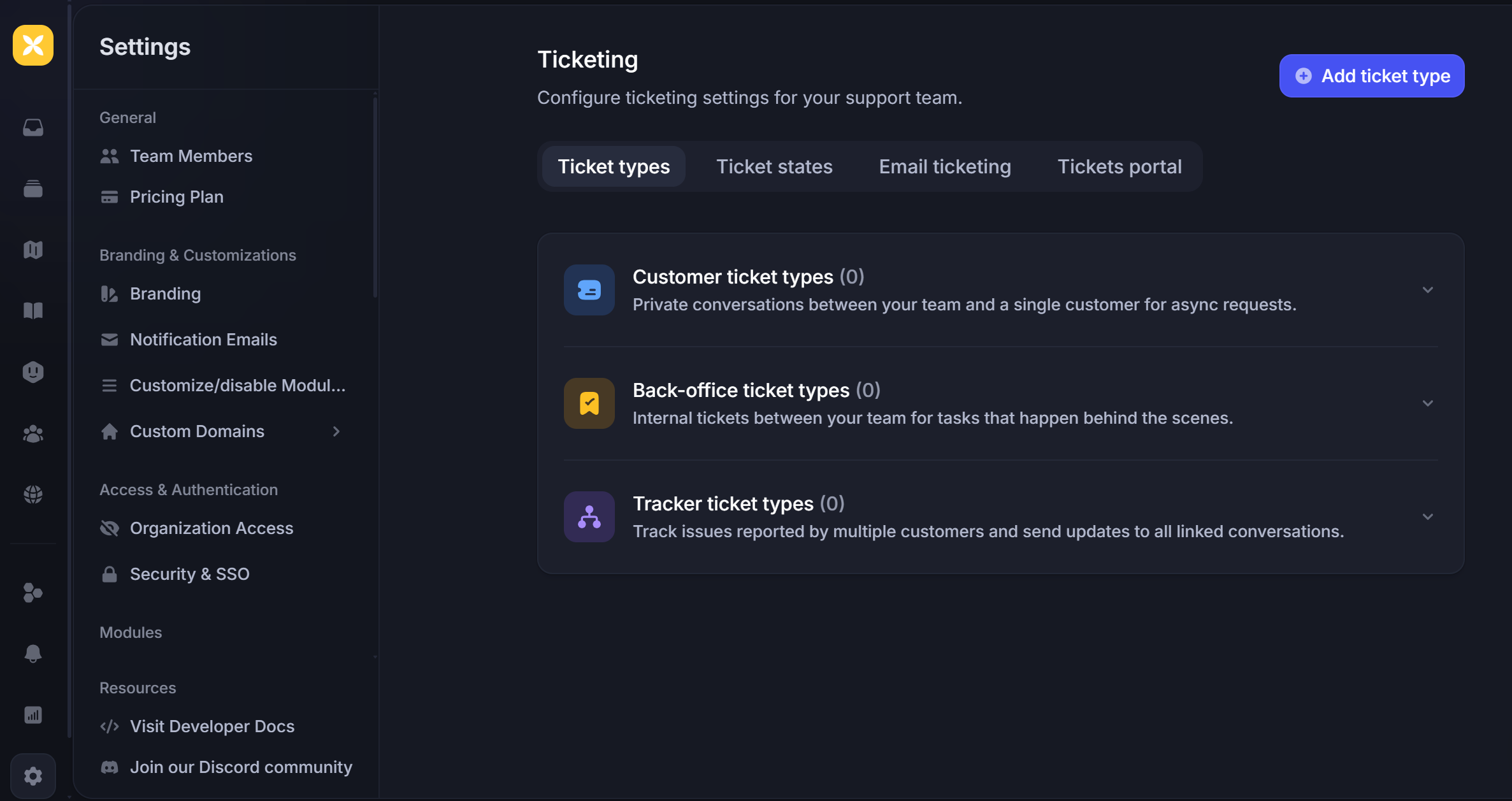 Featurebase (that's us!👋) does that by turning conversations into structured tickets with statuses, assignees, and custom fields. Teams can create customer tickets for async support requests, back-office tickets for internal work, and tracker tickets for issues that affect multiple customers.